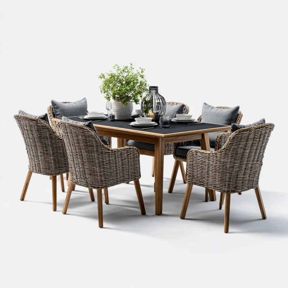 Garten-Esstisch-Set Teakholz und Geflecht 200x100 cm – Schwarz/Natur – Moderne Outdoor-Möbel
