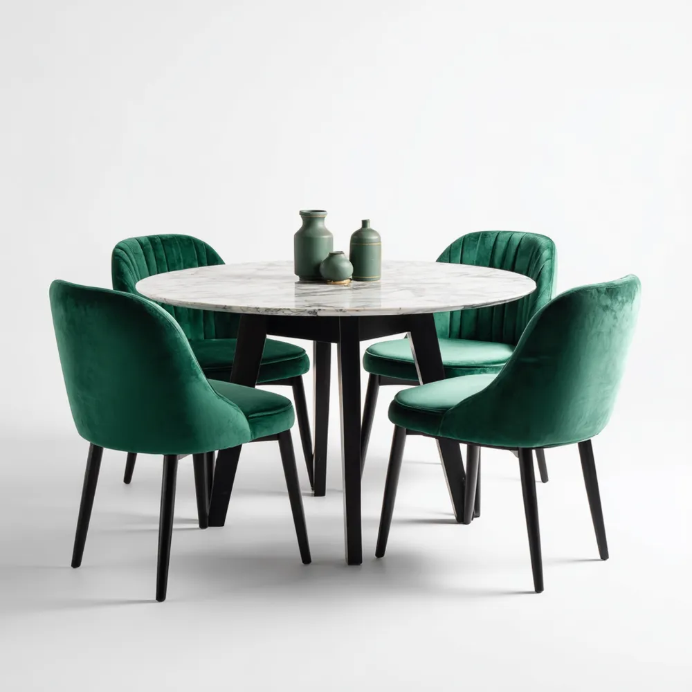 Dieses stilvolle Esszimmer-Set besteht aus einem runden Marmortisch und vier Samtstühlen in einem eleganten Grün. Perfekt für moderne Wohnräume.