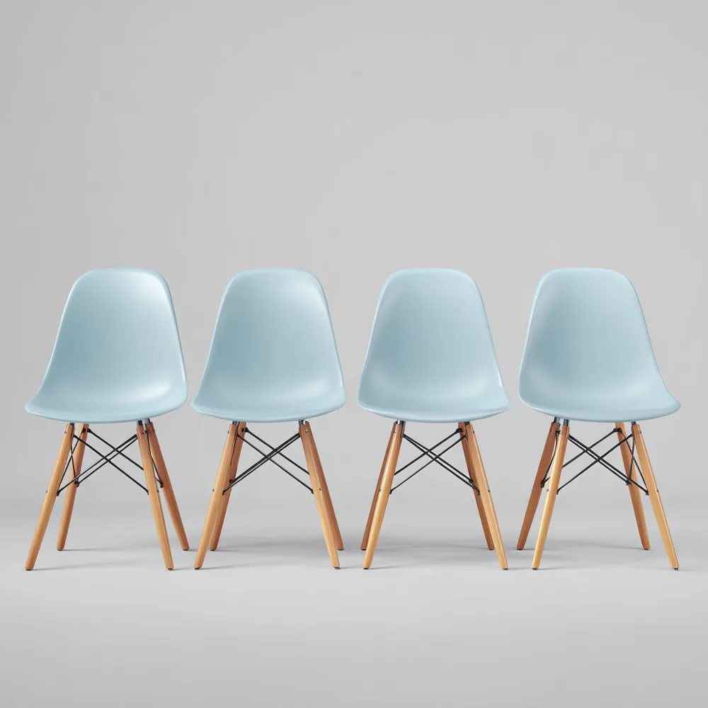 Materialien und VerarbeitungDer Stuhl ist aus robustem Kunststoff gefertigt und besitzt Beine aus hochwertigem Holz in einer Hellblauen Farbe, die für einen sanften Farbakzent sorgen.