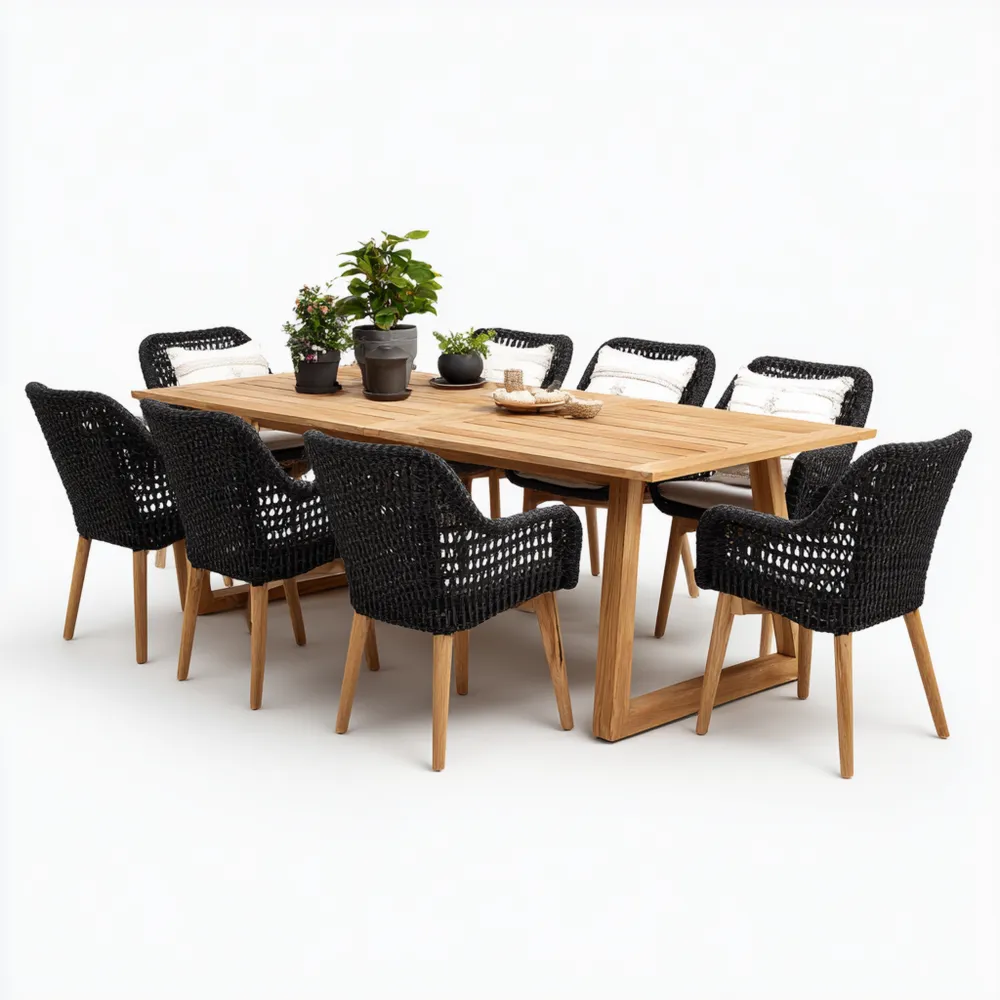 Material und VerarbeitungDer Tisch besteht aus robustem Teakholz, während die Stühle ein zeitgemäßes Geflecht in Schwarz aufweisen. Das Set ist wetterfest und pflegeleicht.
